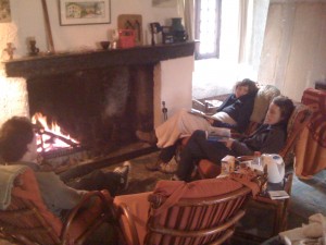 A notre retour de la promenade, la température n’a pas beaucoup monté, le thermomètre n’indique qu’un timide 14 degrés. Après s’être réchauffés avec un chocolat chaud brûlant, nous nous rassemblons autour du feu pour prendre l’apéro et jouer à un jeu de société. Les pieds dans le feu, le porto et les plaids de Granny sur les genoux nous permettent de passer notre première soirée de manière très agréable!