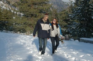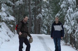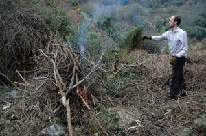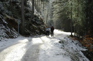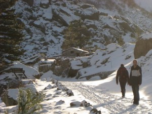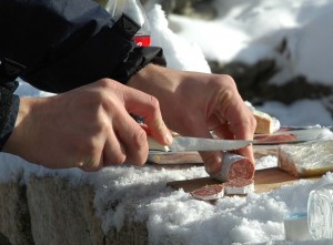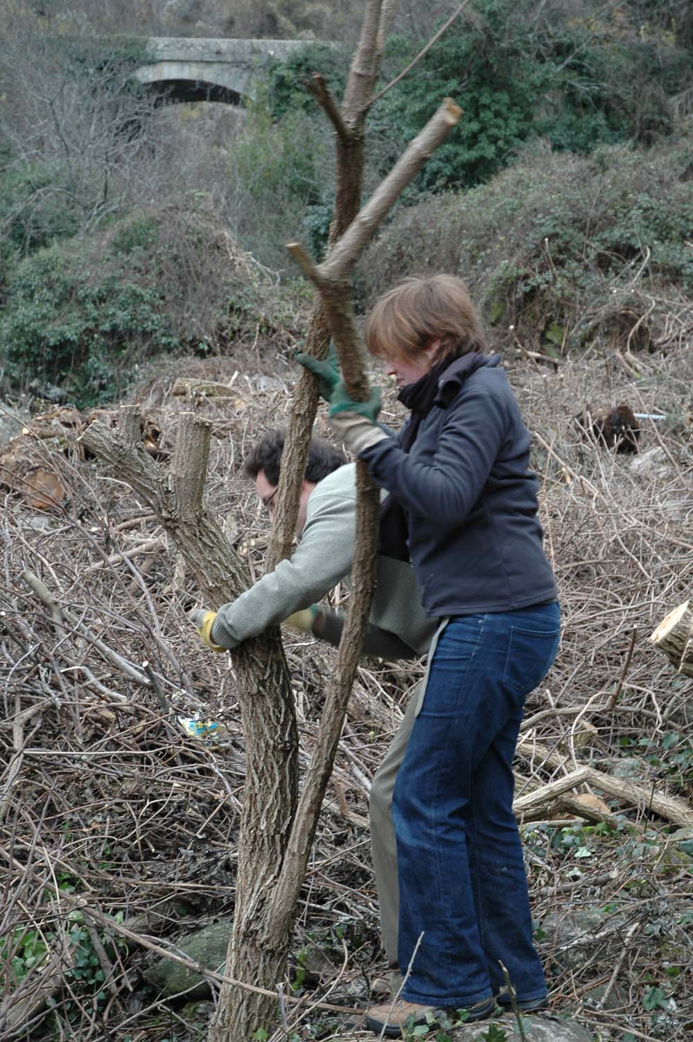 Le paysage est inhabituel, les sommets sont blanchis par la neige, l’herbe est verte et le kaki est couvert de “boules de Noël”. Le payasage est vert et humide, on se croirait en automne! Première préoccupation, faire un grand feu dans la cheminée car le thermomètre indique 10 degré à l’intérieur. Pas vraiment une surprise! Une fois que c’est mis en route, nous nous lançons dans une corvée bois, ce qui est fort efficace pour se réchauffer. En une heure, nous avons remonté du torrent un tas de bois assez impressionnant! Après avoir entassé et rangé le tout sous l’escalier, nous songeons à nous détendre. Laetitia nous donne quelques calories avec une délicieuse soupe fraîche aux poireaux qui nous réchauffe.